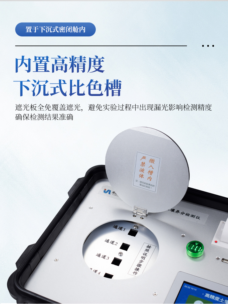 ★18.比色槽内置于下沉式密闭舱内,直径为15.7cm圆形遮光板全面覆盖遮光,避免实验过程中出现漏光影响检测精度,保证检测结果准确。