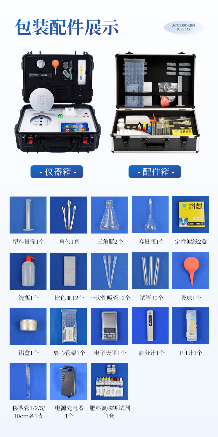 | 1 | 主仪器(内置打印机) | 1台 | 1 | 肥料养分试剂 (氮、磷、钾、有机质) | 1套 |