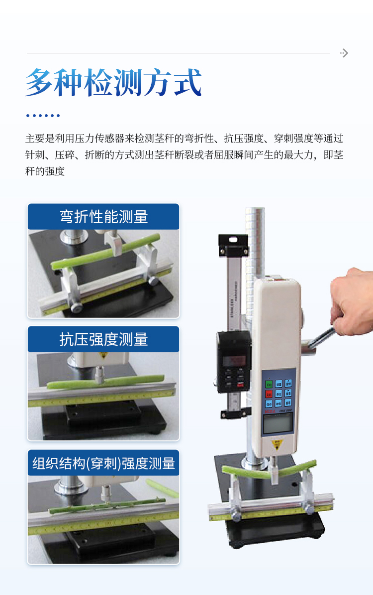 1、三种不同测头:可进行茎杆弯折性能测量、茎秆抗压强度测量、茎杆组织结构(穿刺)强度测量;弯折支架距离可调,并标有刻度。
