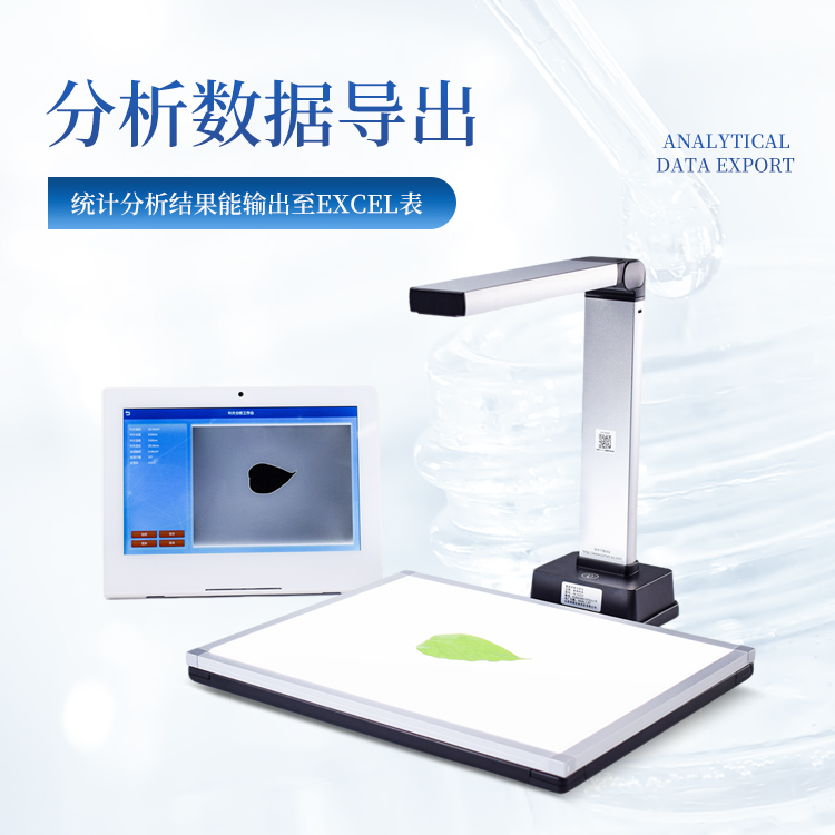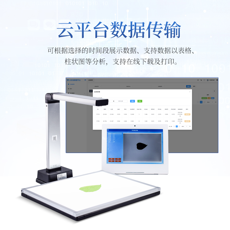 云平台数据传输:数据可上传至云平台,可按照任意时间段和叶片类别检索历史数据,可查看测量时间叶片面积、周长,最大叶长、最大叶宽,矩形度,凹凸比,球状性,形状系数,虫洞数量,虫洞面积等数据,可对不同参数做柱状图分析,支持数据以EXCEL表格形式导出,可根据选择的时间段展示数据、支持数据以表格、柱状图等分析、在线下载。