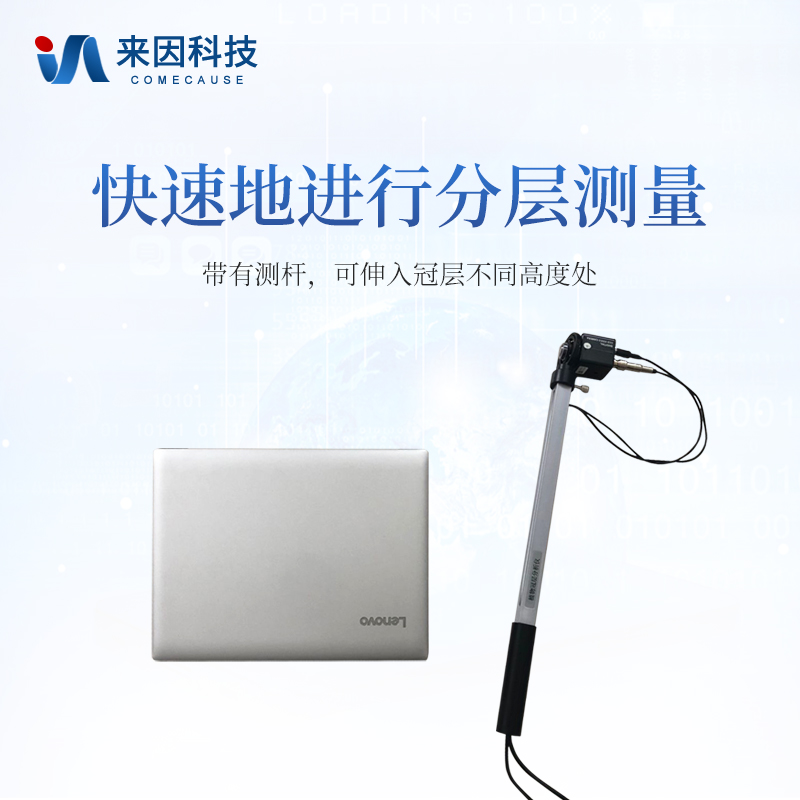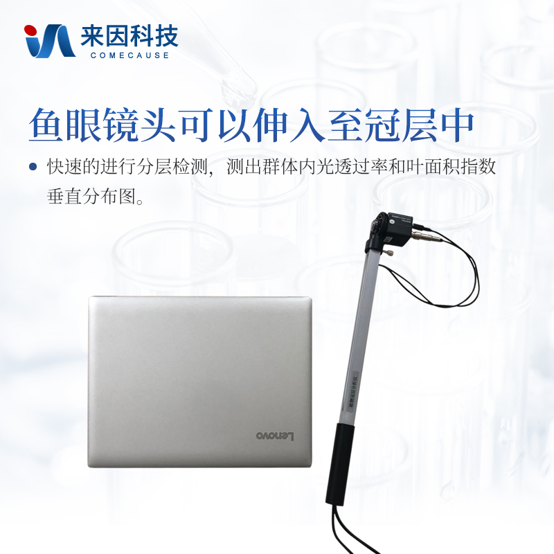 鱼眼镜头可以伸入至冠层中:镜头安装在摇臂一端,由于小巧和带有测量杆,可以方便地水平向前或垂直向上伸入到冠层不同高度处,快速地进行分层测量,测出群体内光透过率和叶面积指数垂直分布图;
